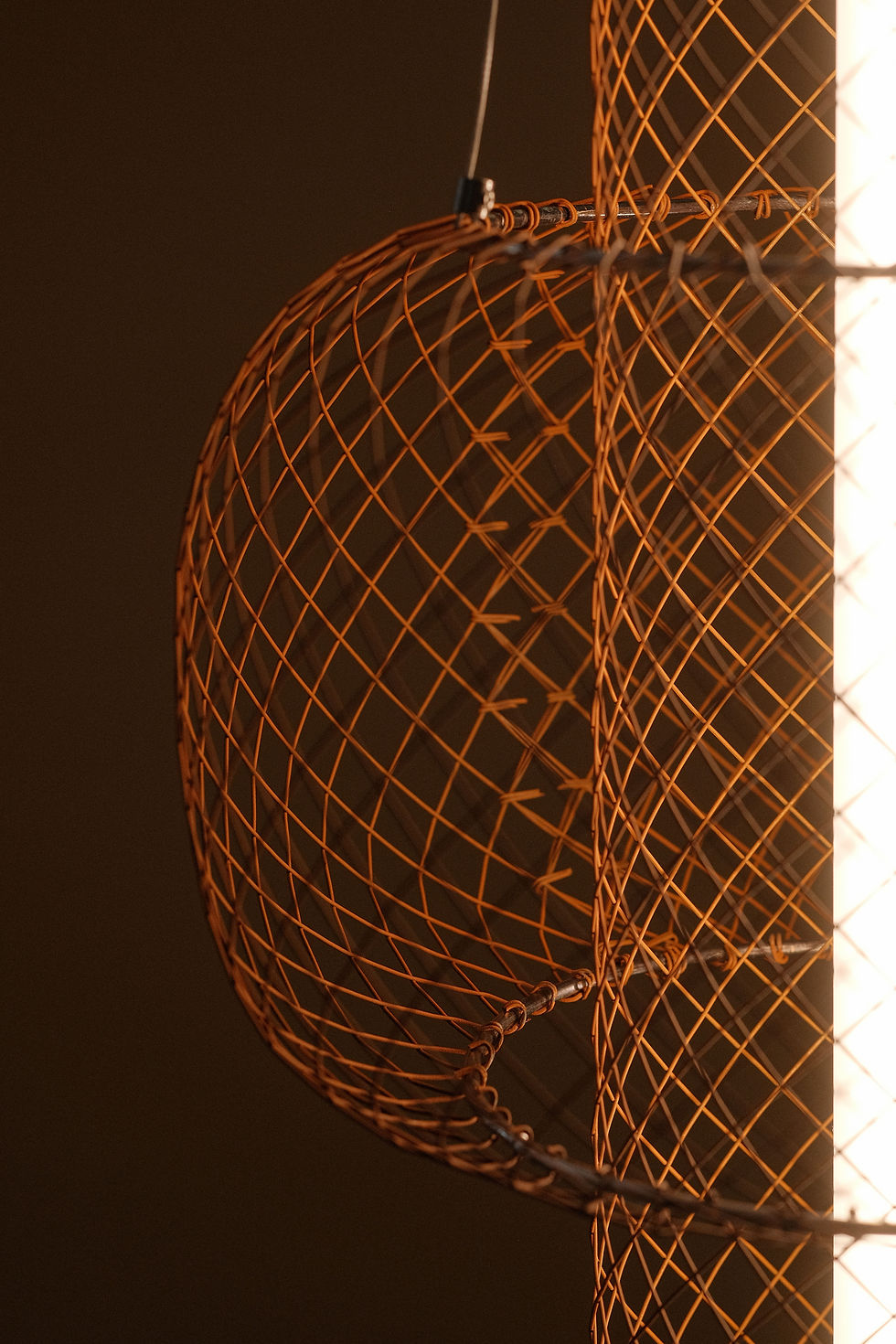 Suspension lamp providing diffused light. Consists of two floating metal mesh units, one inside the other, and a frosted light tube in the center.